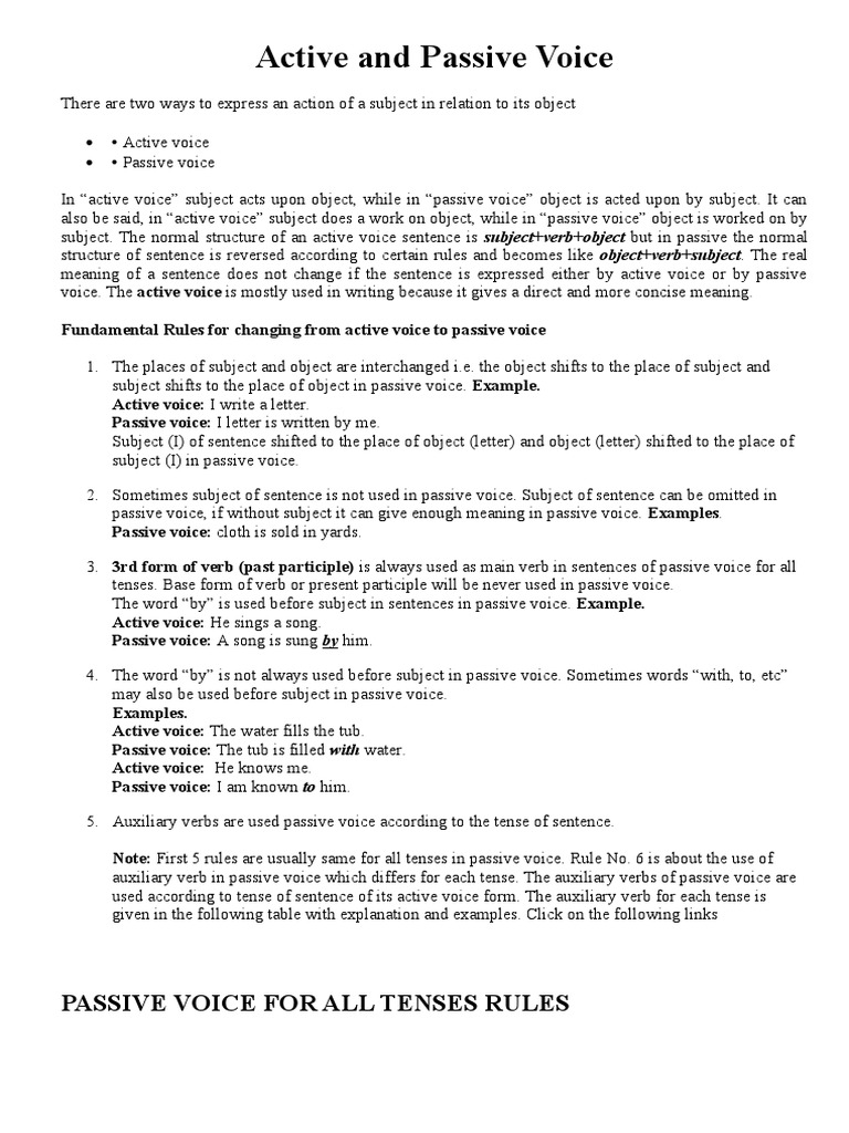 The passive voice is often maligned by teachers and professors as a bad writing habit. It gives examples of both, and shows how to turn a passive sentence into an active one. Other verbs like this are: If it's a long sentence and you know who the subject. The company was sold for $5 million. The passive voice is used when we want to emphasize the action (the verb) and the object of a sentence rather than subject. In the example, b becomes the subject. All students were given a term paper and asked to deliver them in the best way. With the passive voice, the subject is acted upon, so we can say that the subject is being passive in the sentence. Examples and definition of an active and passive voice. As an author, you need to learn how to write both ways. Give the focal point of the sentence its due — (noun) (verb) (noun), and demote the false subject to the back of the line. For example, we use the present simple in the passive to talk about general or permanent states, or general facts some verbs are more common in the passive than the active voice.